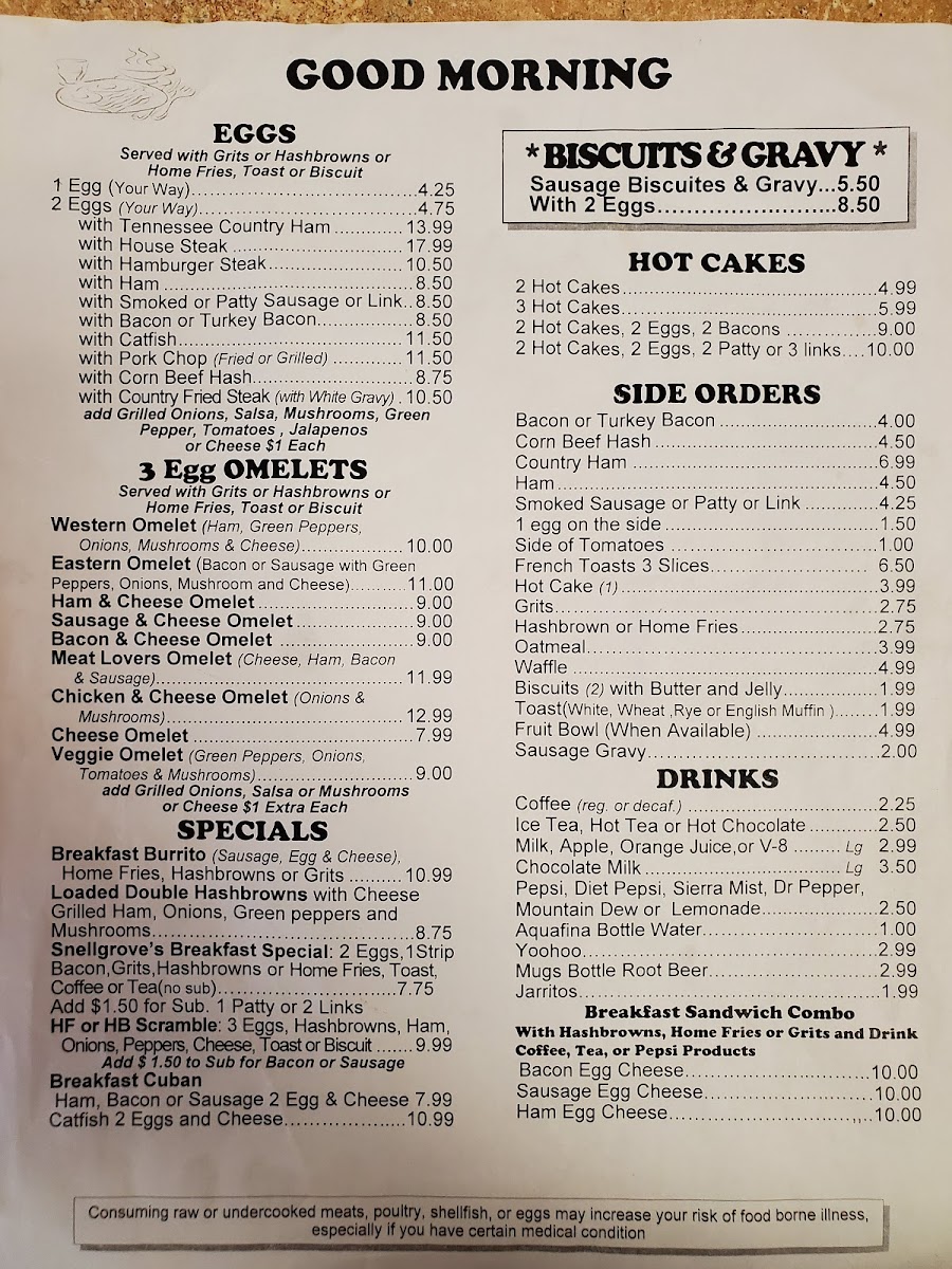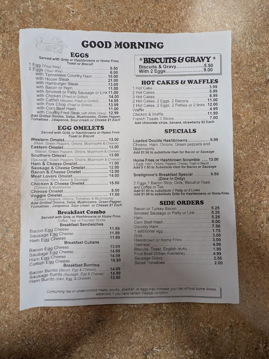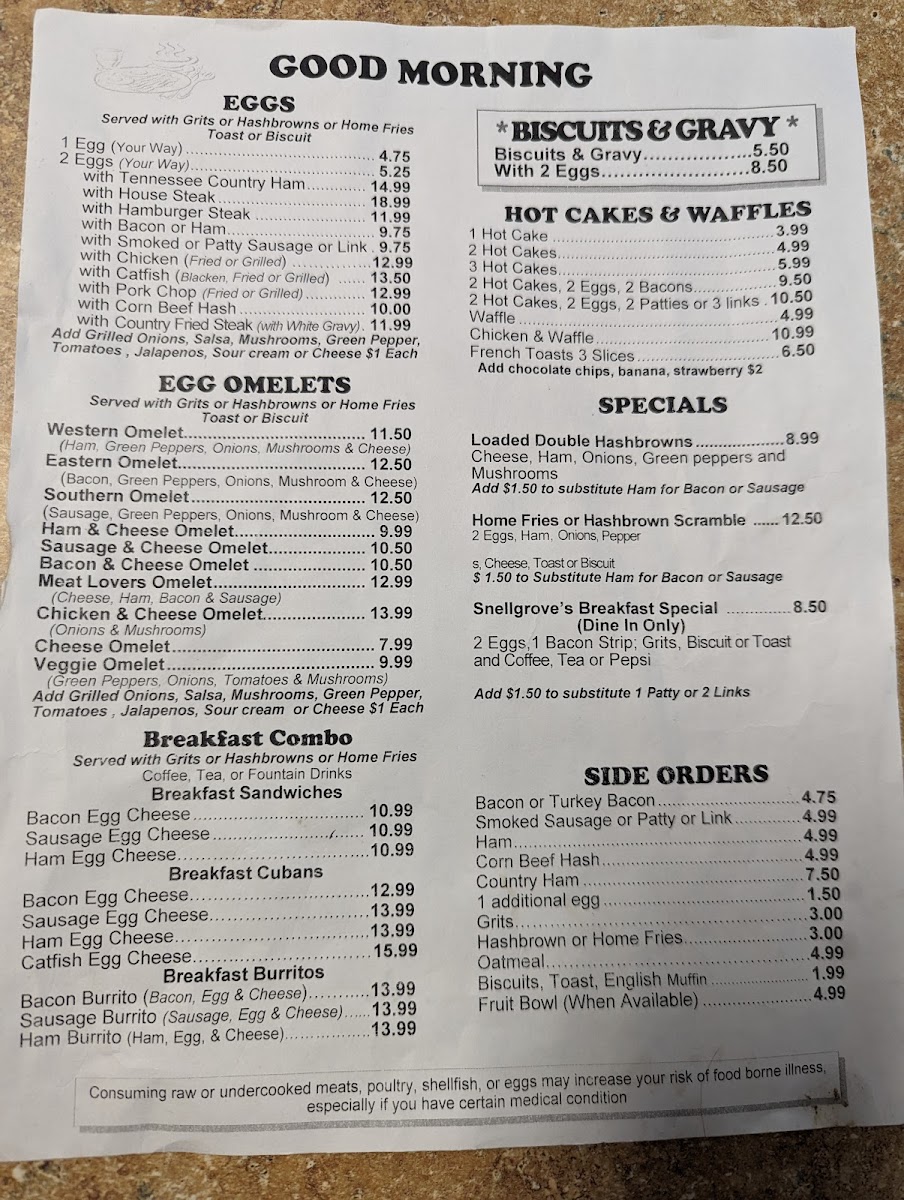Snellgrove's Restaurant Menu