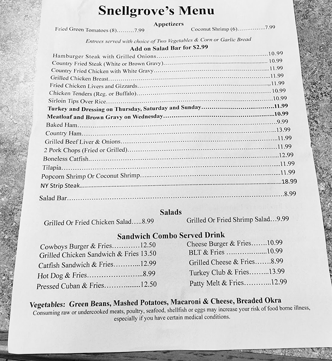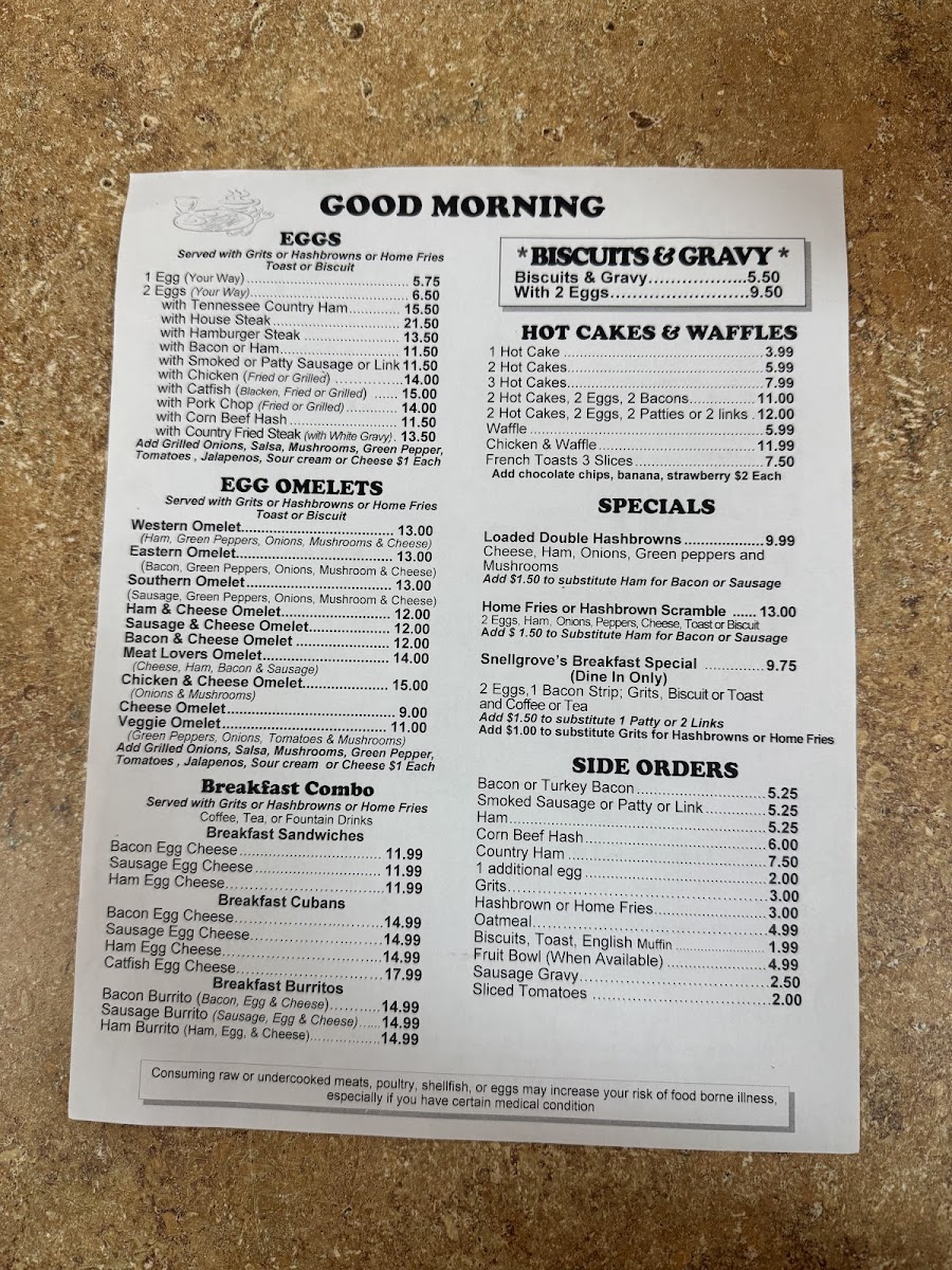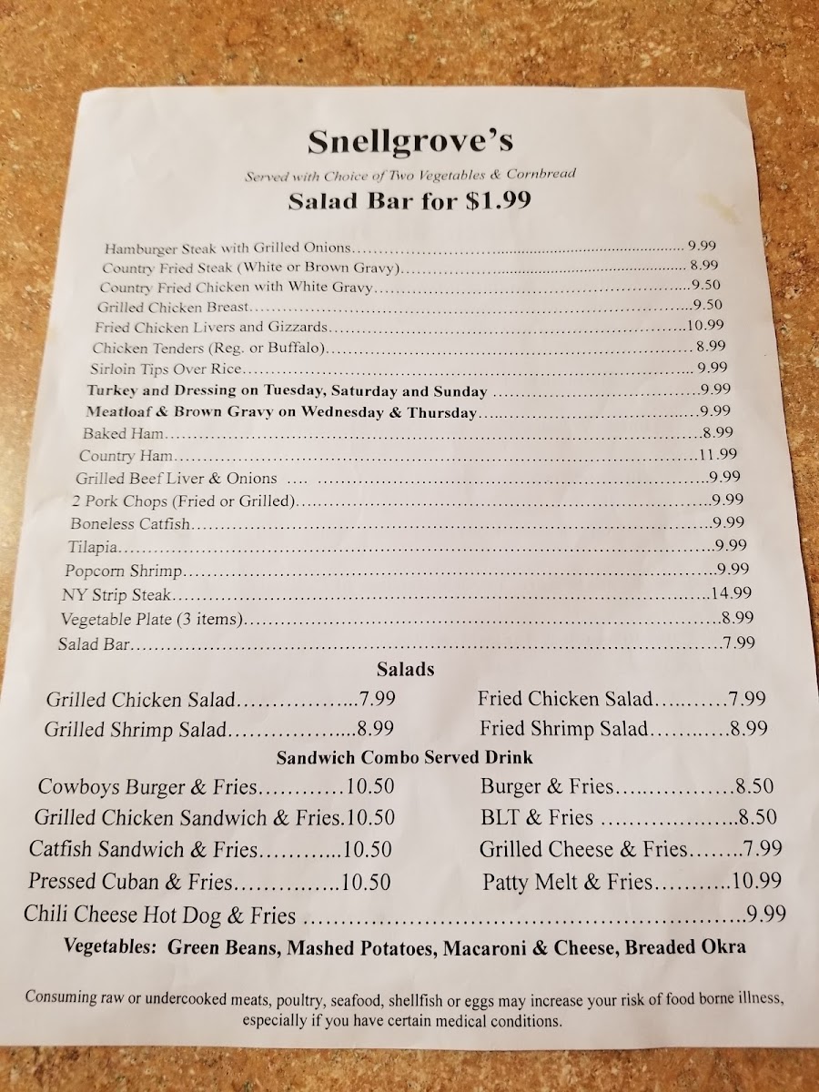 Snellgrove's Restaurant Menu