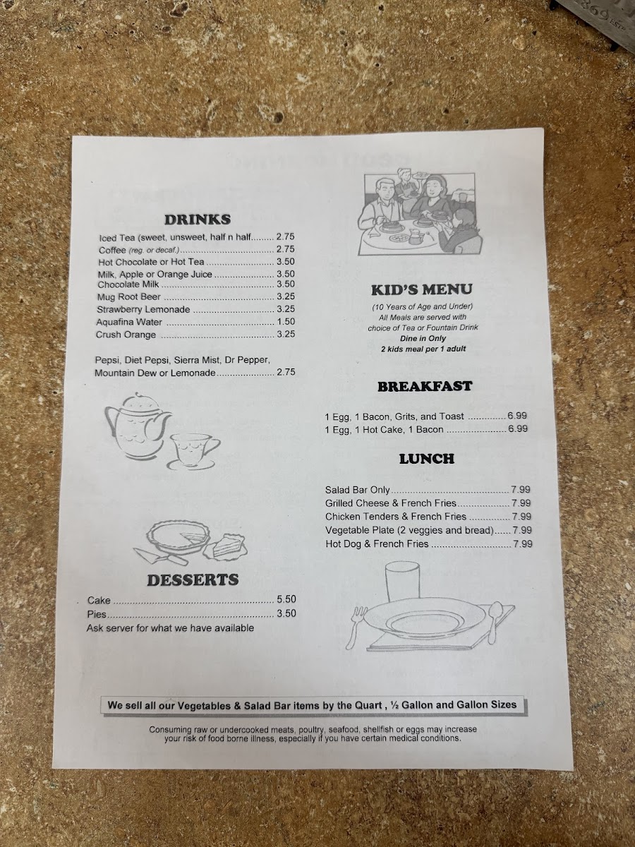 Lunch and dinner choices include country fried chicken with white gravy, hamburger steak with grilled onions, fried catfish, southern-influenced items like the Southern omelet and corned beef hash, as well as dinner specials which occasionally feature meatloaf with brown gravy served with vegetables and bread.